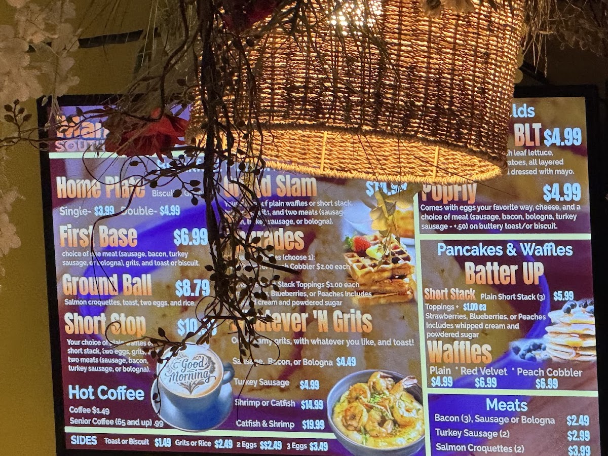Take our first base up a notch: it includes your choice of a plain waffle or a short stack of pancakes with two eggs, grits, and one meat (sausage, bacon, turkey sausage, or bologna). Upgrade to signature waffles or Signature short stack with toppings for an additional cost.